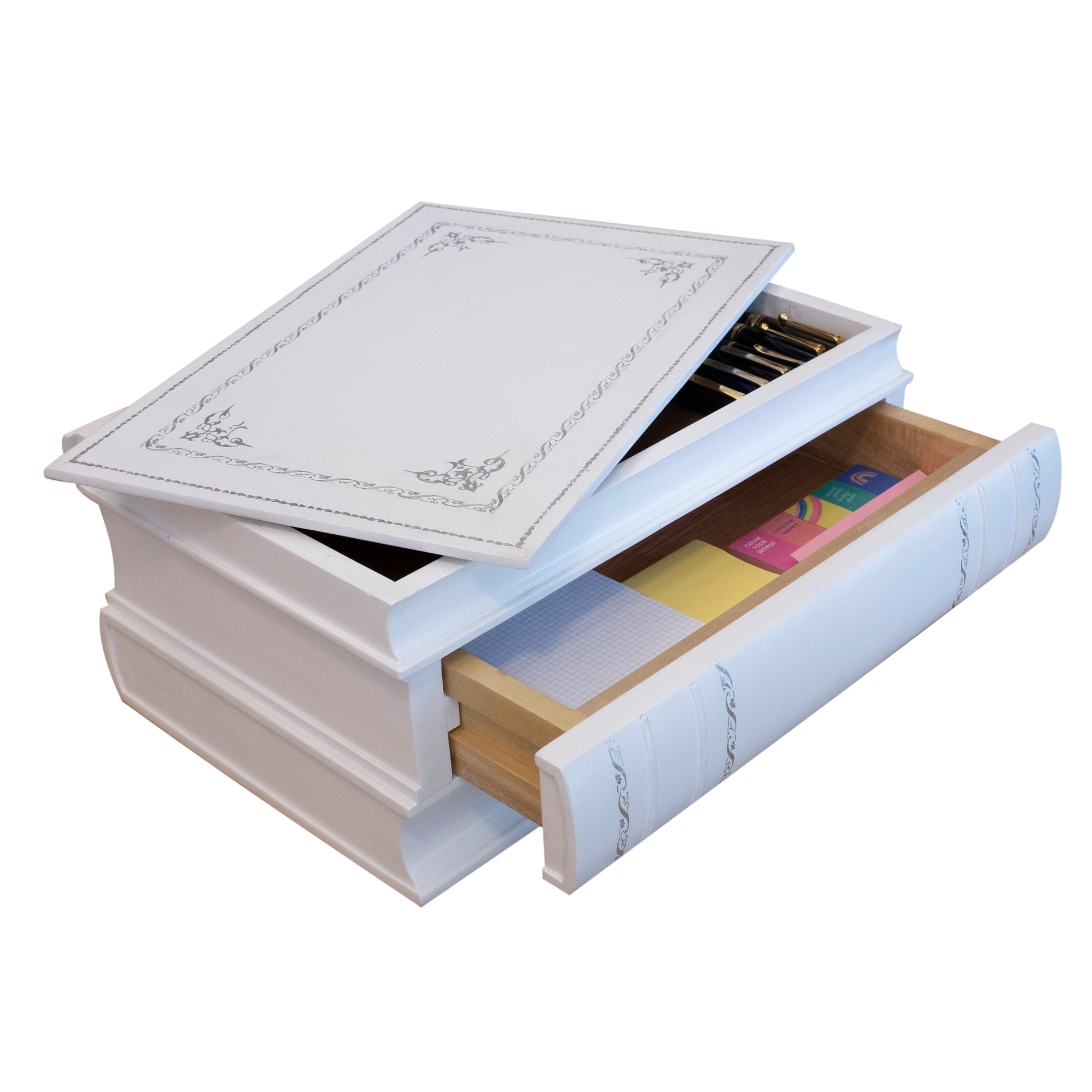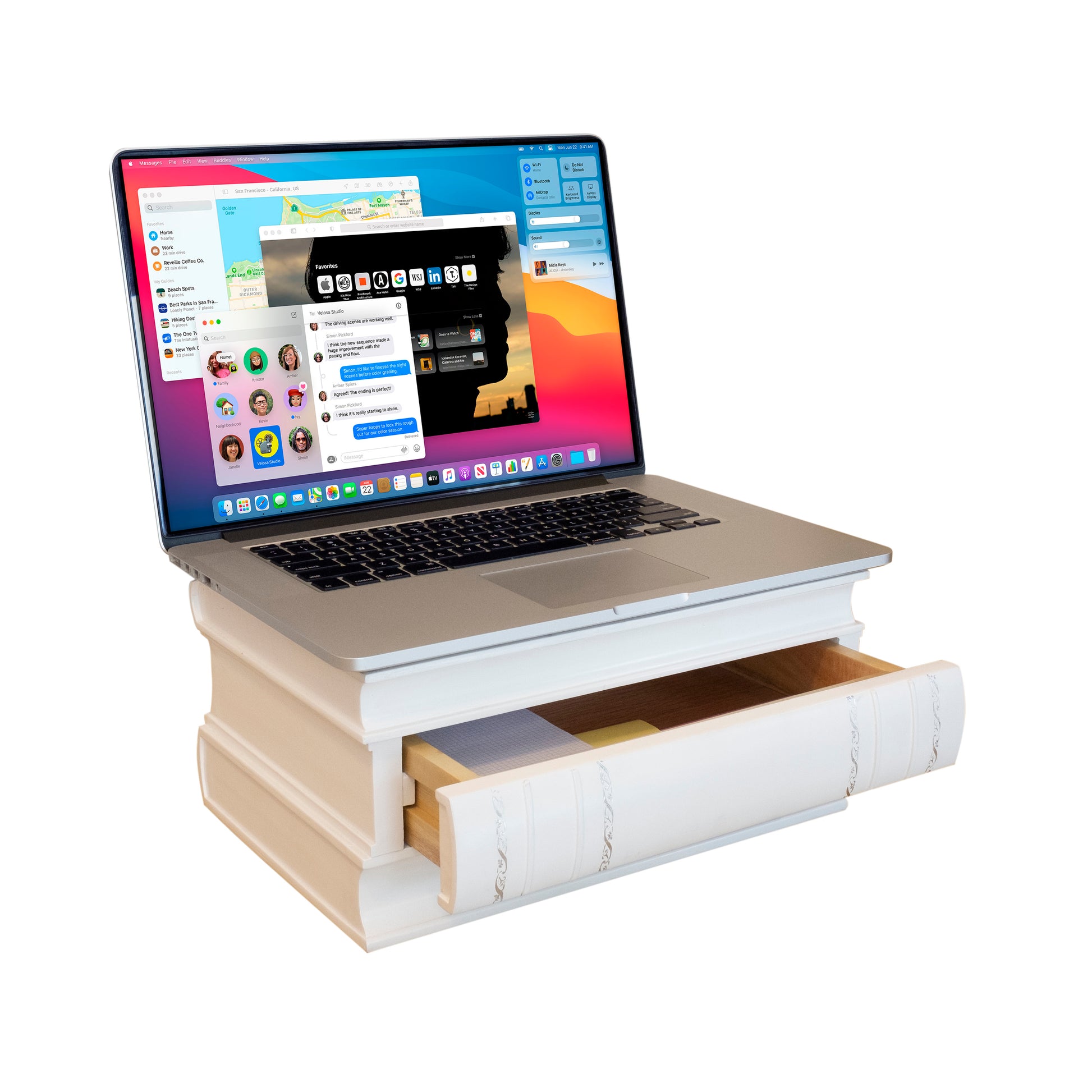 - Premium white wooden storage that can also be a functional laptop riser.