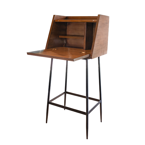 Compact wooden writing desk with folding top, with width in wood-stain finish and black metal painted base.