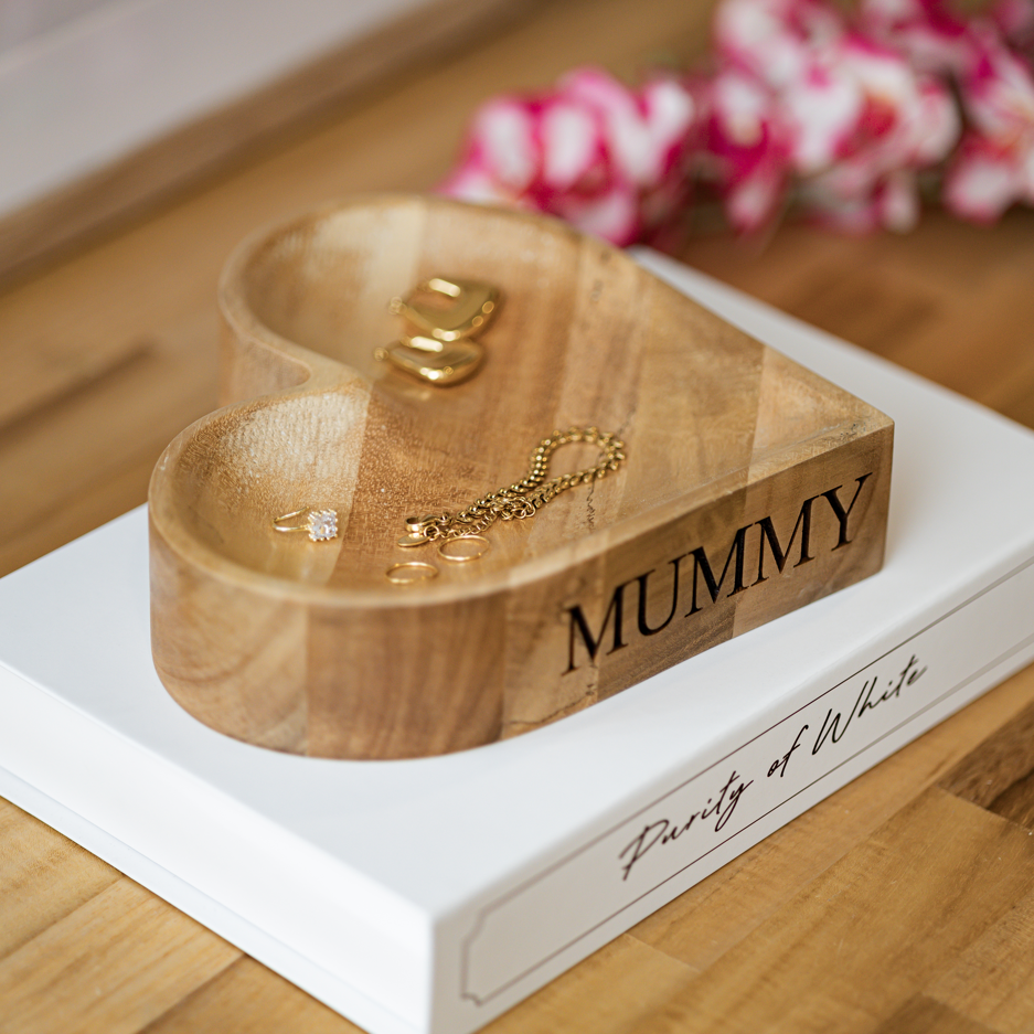 Heart-shaped wooden jewelry dish crafted from solid Gmelina wood with a stunningly smooth finish. A unique and romantic way to display your most treasured possessions.